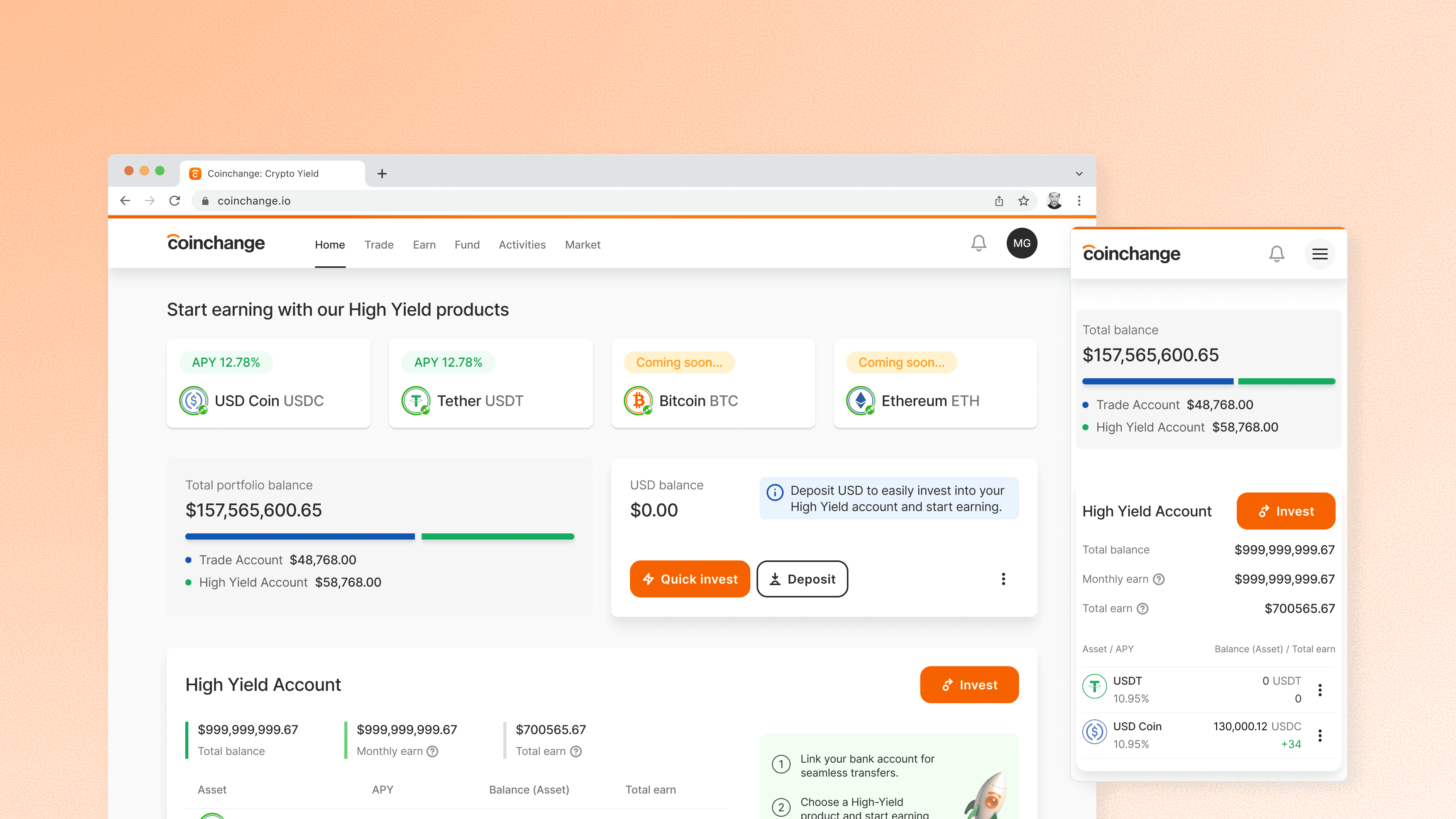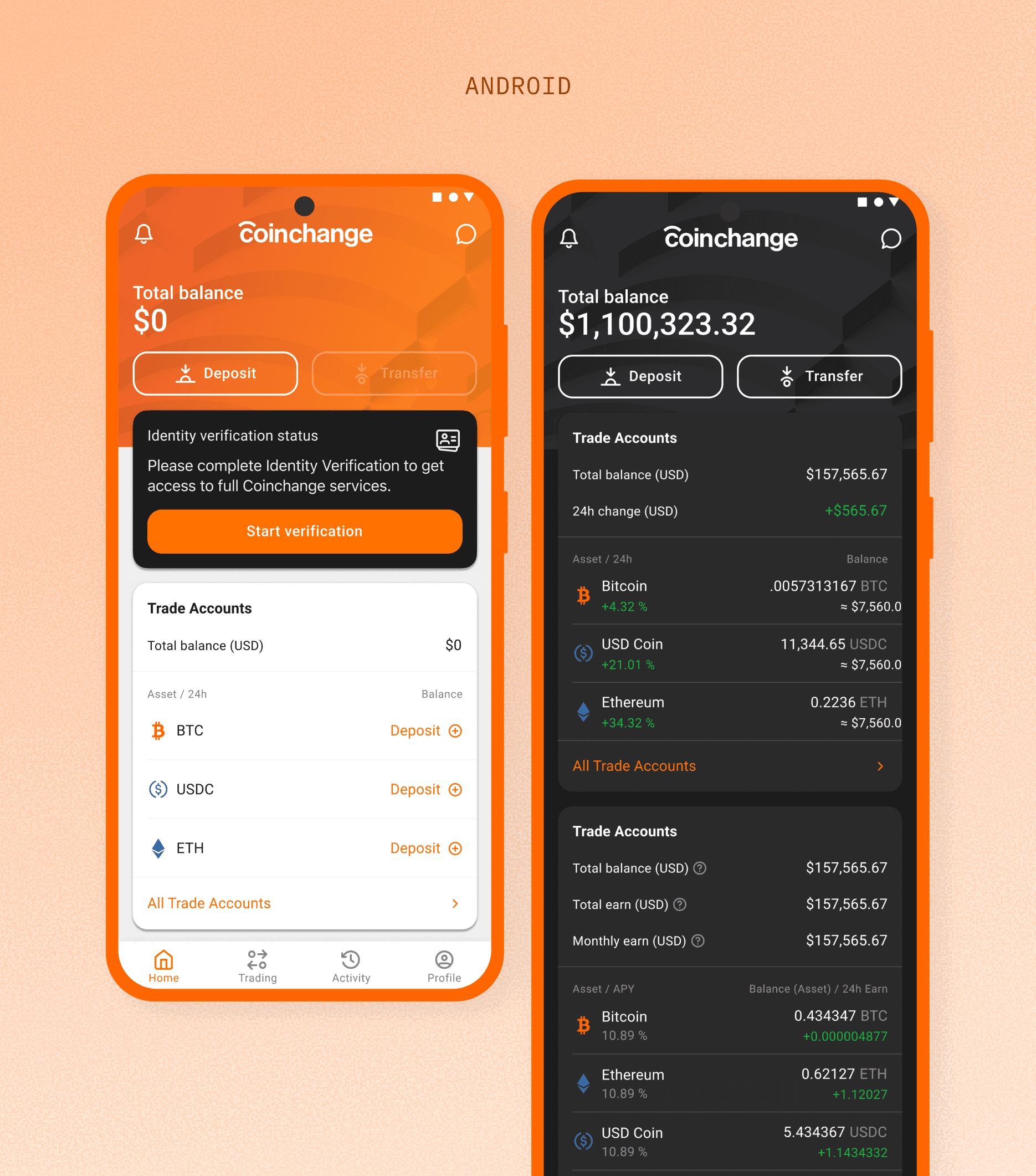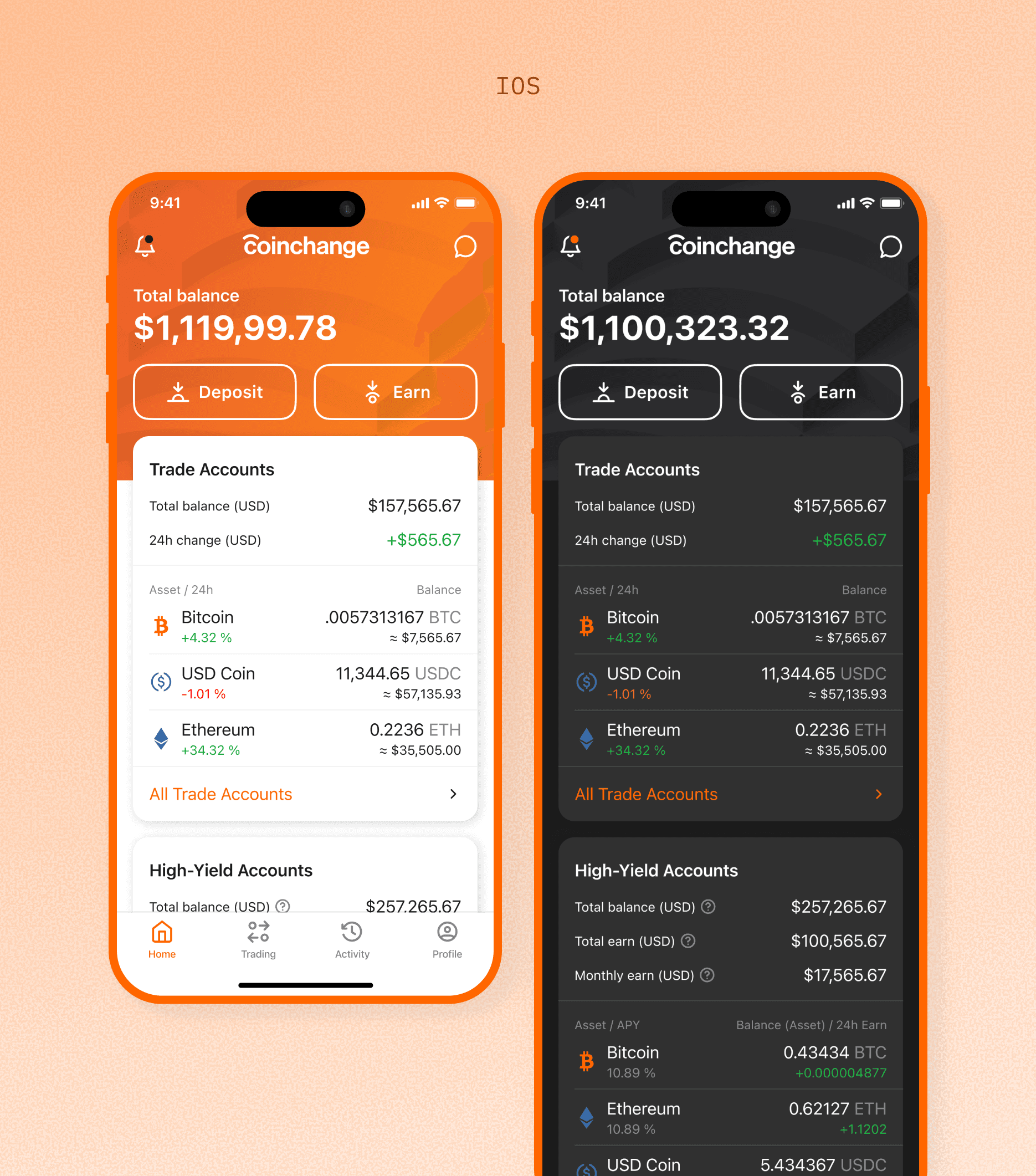 Coinchange started as a crypto brokerage and was pivoting into yield, which meant the product needed to serve two very different jobs: a trading account for buying and selling crypto with fiat on/off ramps, and an earn account that abstracted away all the DeFi mechanics behind a clean, trust-building interface.