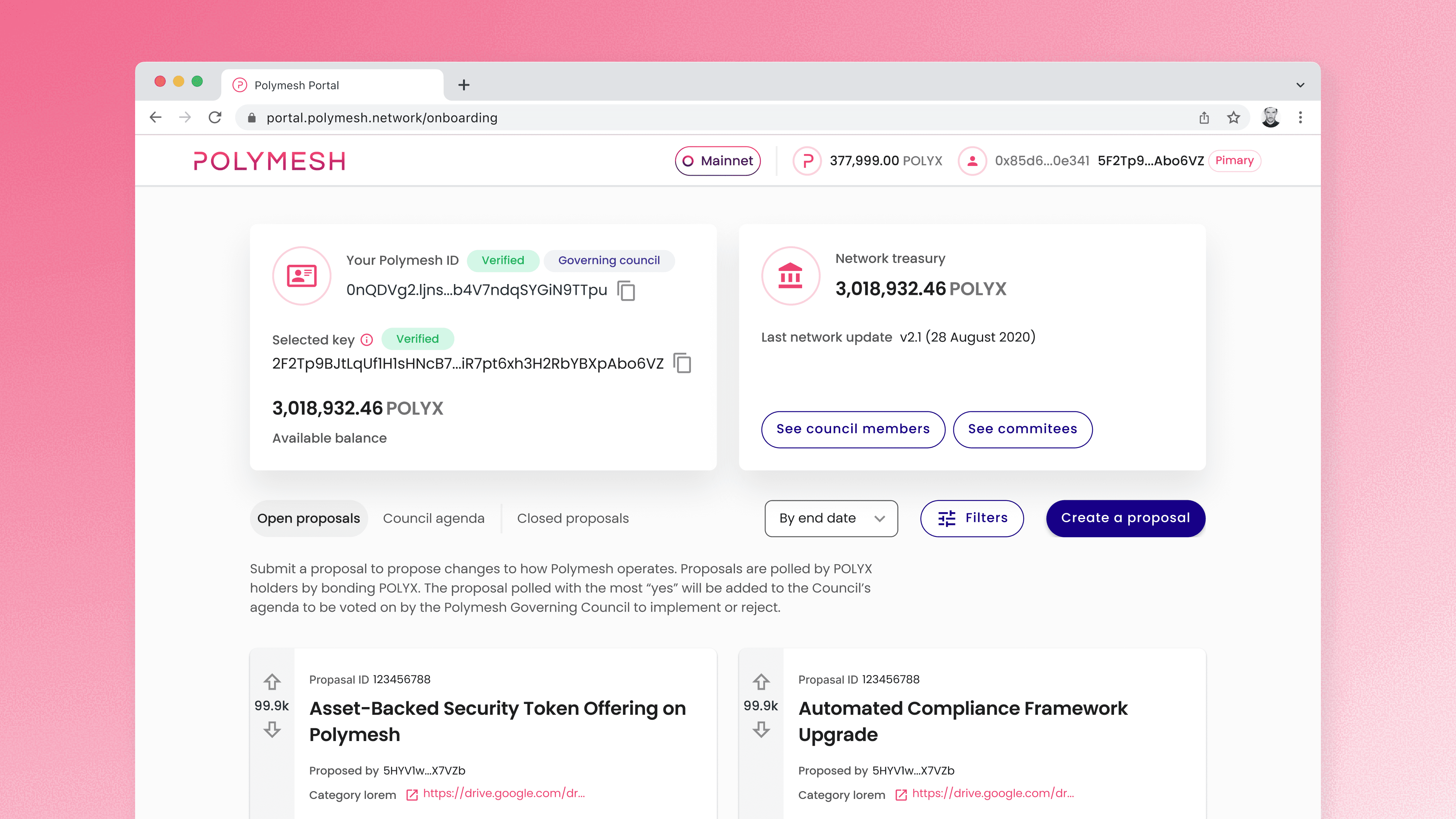 Token Studio v2 shipped as the primary self-service interface for creating and managing tokens on Polymesh, and eventually evolved into what is now the Polymesh Portal, the central hub for all on-chain activity on the network. The Governance app gave the Polymesh community a transparent and usable way to participate in protocol-level decisions, which is critical for a public permissioned chain that relies on active stakeholder engagement. The staking interface enabled token holders to actively secure the network and earn rewards through a process that felt familiar rather than intimidating.
